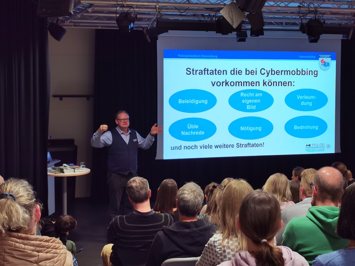 Polizeioberkommisar Achim Kruzinski vom Polizeipräsidiums Ravensburg (Referat Prävention) zeigte in seinem Vortrag die Gefahren des Internets aus polizeilicher Sicht auf. Er ging dabei auf strafbare Inhalte ein, welche potentiell auf den Smartphones von Kindern und Jugendlichen zu finden sein könnten.
