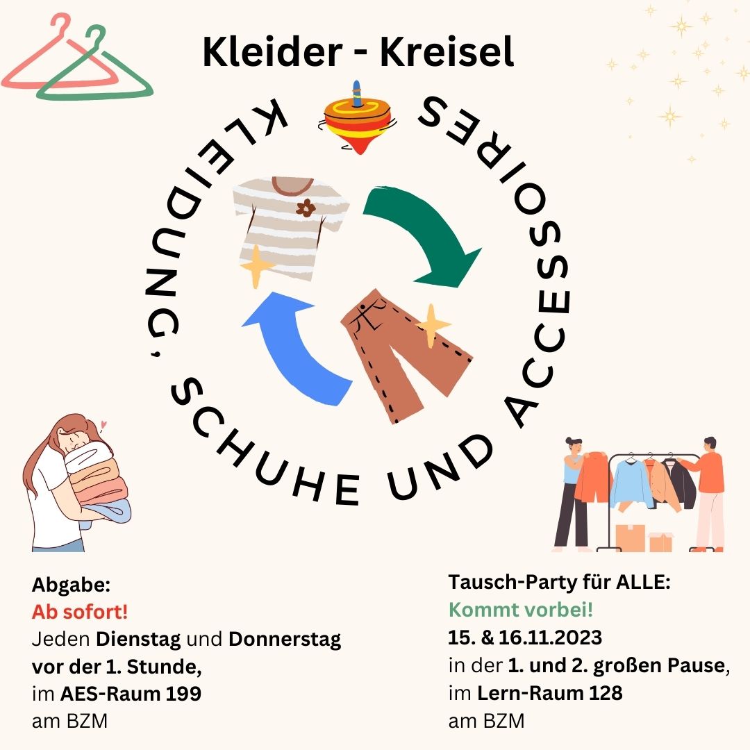 Der Kleider-Kreisel am BZM, ein Kleidertausch-Markt von Schüler*innen für Schüler*innen, bietet die ideale Plattform dafür. Hier kann nachhaltiger Konsum real erlebt und getätigt werden. Wir setzen an unserer Schule im Sinne der Nachhaltigkeit ein Zeichen gegen den verschwenderischen Umgang mit Kleidung!