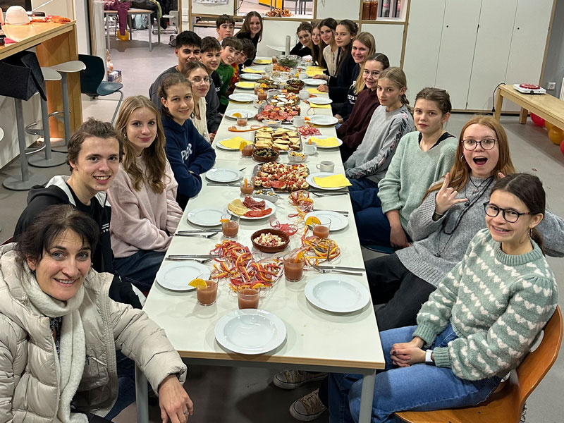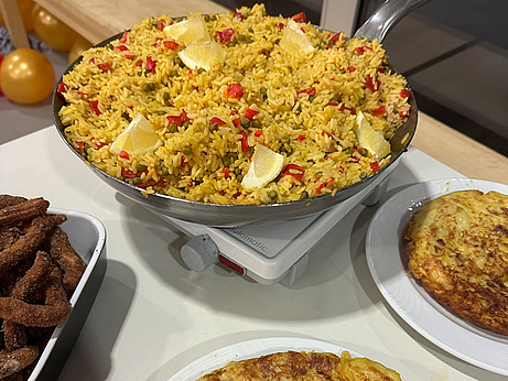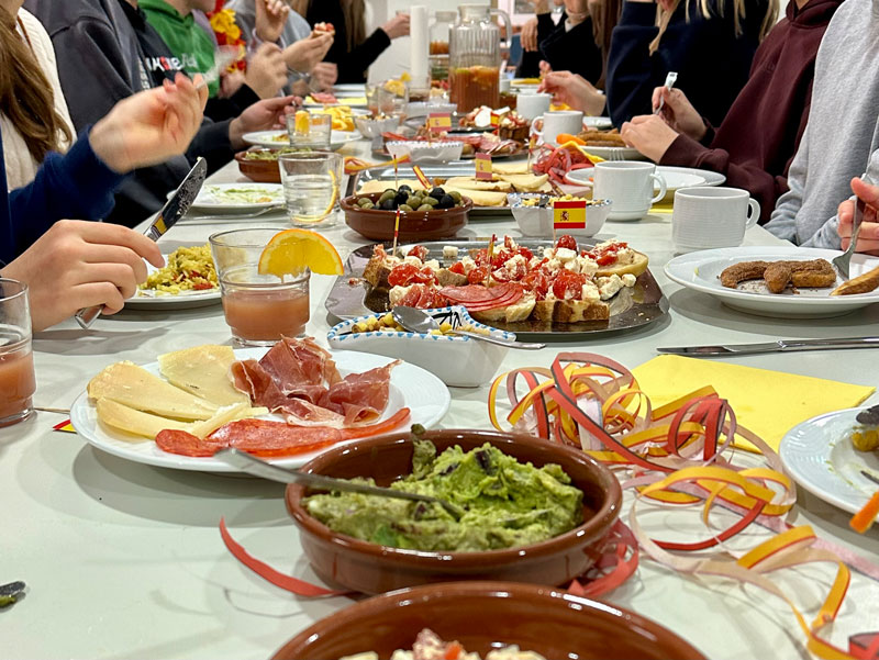 Kurz vor den Ferien hat die Klasse 9abd am 18.12.2026 im Rahmen einer kleinen Weihnachtsfeier einen spanischen Kochabend veranstaltet. In Kleingruppen wurden hierbei verschiedene traditionelle Gerichte wie z.B. Tortilla de patatas, Pimientos de Padrón, vegetarische Paella, verschiedene Tapas, Nachos con queso y guacamole, alkoholfreie Sangría und vieles weitere zubereitet. Als Nachtisch gab es die in der Klasse beliebten Churros con chocolate.