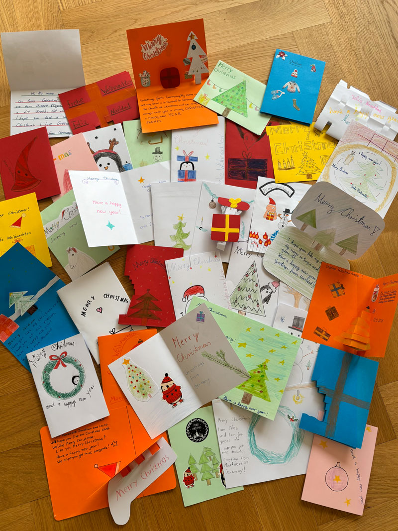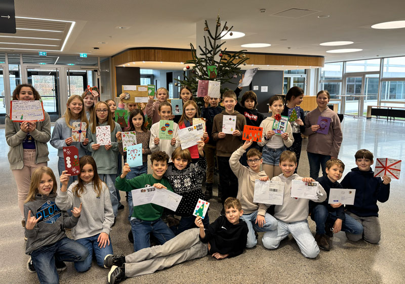 Die Klasse 5d des Gymnasiums hat im Rahmen des Englischunterrichts an ihrem ersten eTwinning-Projekt mit dem Titel „Mail a Merry Christmas“ teilgenommen. Dabei gestalteten die Schülerinnen und Schüler selbstgemachte Weihnachtskarten, die sie auf Englisch verfassten und an Schulen in Polen, Italien, Griechenland, Spanien und Litauen verschickten. Im Gegenzug erhielten sie ebenfalls liebevoll gestaltete Weihnachtskarten. Das Projekt ermöglichte den Schülerinnen und Schülern, Englisch praktisch anzuwenden und erste europäische Kontakte zu knüpfen.