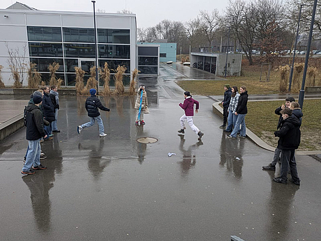 Zurück an der Schule, es regnete immer noch, haben wir das italienische Spiel „ruba bandiera“ gespielt, bei dem es darum geht, ein Tuch vor der anderen Mannschaft zu schnappen und in Sicherheit zu bringen.